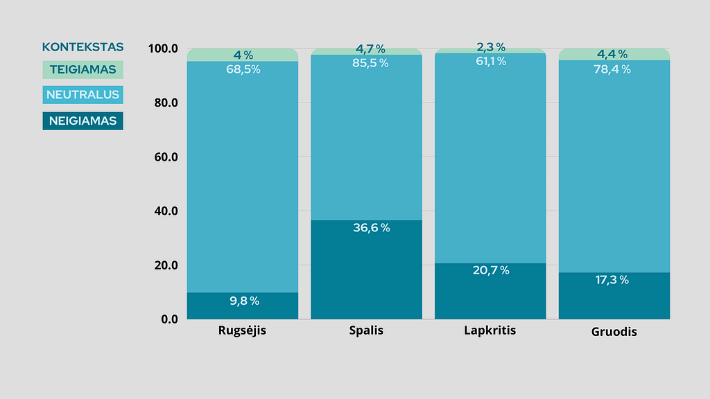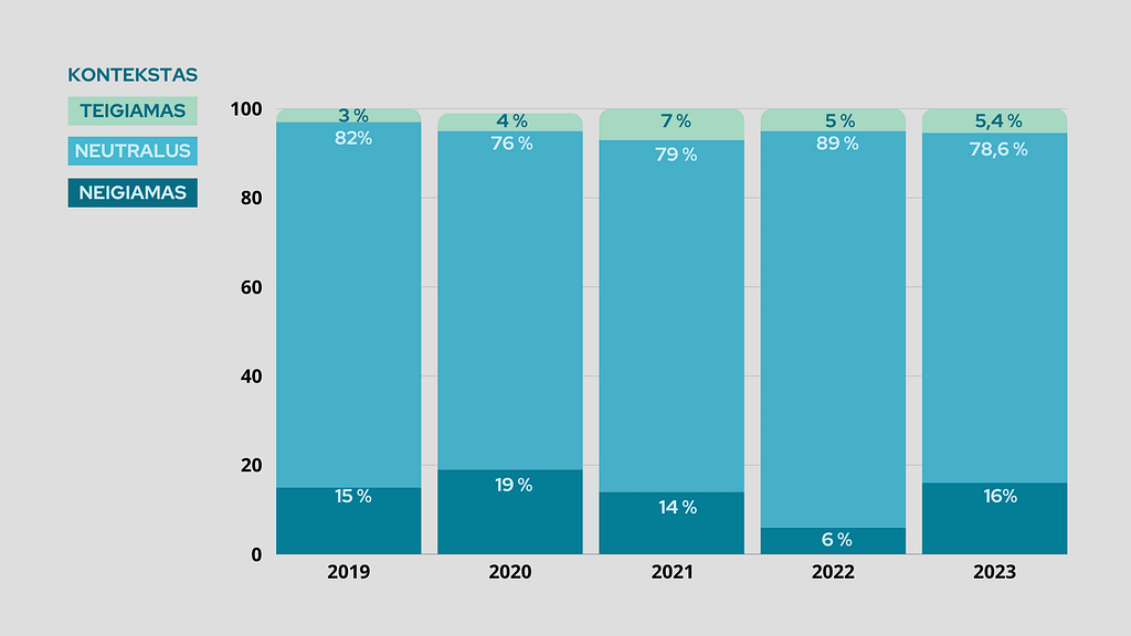 Apibendrinant konteksto pasiskirstymą pastebima, kad nors pozityvaus turinio dalis nežymiai augo (lyginant 2023 ir 2022 metų duomenis), neigiamas turinys sudaro daugiau nei dvigubai didesnę dalį nei 2022 metais ir beveik tris kartus viršija teigiamo konteksto dalį.