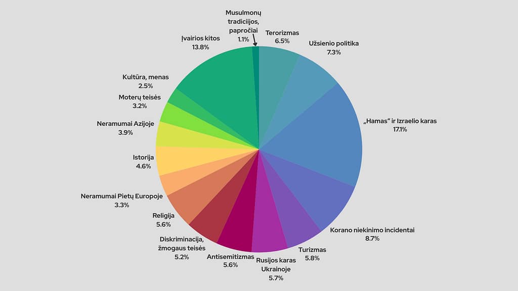 Žiniasklaidos darbai, kuriuose minimi musulmonai, buvo įvairių temų. Publikacijų, kuriose minimi musulmonai, padaugėjo po konflikto tarp „Hamas“ ir Izraelio paaštrėjimo, darbai šia tema sudarė arti penktadalio viso turinio. Musulmonų religinė bendrija dažnai minėta įvairiuose darbuose apie pasaulio politikos aktualijas, arti dešimtadalio darbų sudarė pranešimai apie Korano niekinimo incidentus Skandinavijos valstybėse, 6,5 proc. darbų buvo apie teroristinių išpuolių grėsmę ar istoriją, 5,7 proc. publikacijų buvo apie Rusijos sukeltą karą Ukrainoje. Kitos dažniau pasikartojančios žiniasklaidos darbų apie musulmonus temos: turizmas (5,8 proc.), antisemitizmas (5,6 proc.), religiniai klausimai (5,6 proc.), žmogaus teisės ir kova su diskriminacija (5,2 proc.). Pasakojimai apie musulmonų tradicijas ir papročius sudarė kiek daugiau nei 1 proc. viso žiniasklaidos turinio apie musulmonus.