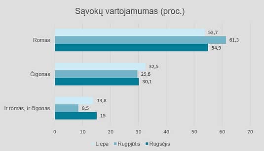 Sąvoka „romas“ buvo vartojama 54,9 % žiniasklaidos darbų, o „čigonas“ – 30,1 %, o likę 15 proc. darbų vartojo abi sąvokas. Santykis panašus į tą, kuris buvo matomas liepos mėnesį – tuomet, kaip ir šį mėnesį, publikacijos, vartojusios abi sąvokas, daugiausiai buvo apie romų kultūrą.