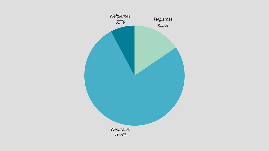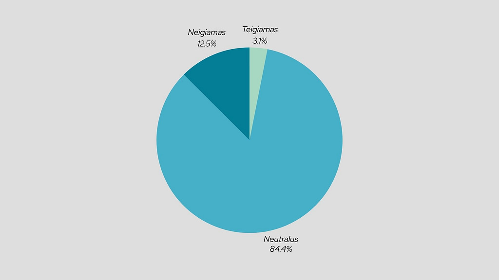 Mažiausią turinio dalį sudarė pozityvios reprezentacijos atvejai. Iš 815 darbų, kuriuose fiksuoti su LGBTIQ+ bendruomene susiję raktažodžiai, tik 20 buvo teigiamo konteksto, tai yra šiek tiek daugiau nei 3 proc. viso turinio.