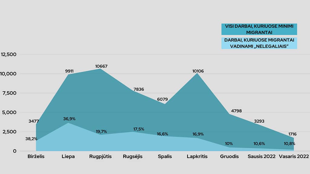 Šių metų vasarį pastebėtas didžiausias žiniasklaidos darbų kiekio pokytis nuo migracijos srautų padidėjimo praėjusią vasarą. Pirmą kartą nuo 2021 metų balandžio, per mėnesį žiniasklaidoje pasirodė mažiau nei du tūkstančiai publikacijų, kuriose minimi migrantai. Vis dėlto „Nelegalaus migranto” terminas, kuris Lietuvos žiniasklaidoje iki praėjusių metų buvo fiksuojamas tik pavieniais atvejais, vis dar vartojamas daugiau nei dešimtadalyje viso turinio apie migrantus.