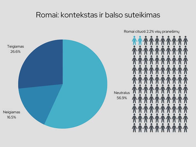 Darbai, kuriuose apie romus kalbėta neutraliai, sudarė kiek daugiau nei pusę visų fiksuotų (57 proc.). Tai yra 23 proc. mažiau nei sausio mėnesį. Vis dėlto vasarį teigiamo konteksto publikacijų skaičius pranoko neigiamo dešimčia procentų. Žiniasklaidos darbai, kuriuose romai minimi teigiamai sudarė beveik 27 proc., o neigiamai – 16 proc. Stereotipai apie romus neigti daugelyje publikacijų, kuriose kalbėta apie Andrew Miksio parodą „Baxt“ MO muziejuje, fotografijų, eksponuotų minėtoje parodoje autorius teigė: „Amerikiečio nuomone, prabilus apie romus, vilniečių vaizduotėje iškart kyla taboro vaizdai, švirkštai, narkotikai. Negatyvūs dalykai, jo manymu, daugiausia įtvirtinti žiniasklaidos. Vis dėlto atokiau nuo sostinės gyvenančių lietuvių šeimose apie romus manoma visai kitaip. „Jų vaikai moka anglų kalbą, daugelis uždarbiavo Jungtinėje Karalystėje ir grįžo pas tėvus į Lietuvą“, – sako A. Miksys” (Romų gyvenimą fotografuojantis Amerikos lietuvis: vis dėlto taboro sunaikinimas buvo klaida, Lrt.lt). Fotografo nuomonę, kad žiniasklaida prisideda prie neigiamo požiūrio į romų tautybės asmenis, patvirtina ir Media4Change atliekamas žiniasklaidos monitoringas, kuris rodo, jog romai dažniau nei kitos stebimos grupės, minimi neigiamai. Jų tautybė dažnai akcentuojama kriminalinės tematikos darbuose. Vasario mėnesį tokio pobūdžio publikacijų fiksuota kiek mažiau nei įprastai, 10. Tačiau pastebėta, kad romai su kriminaline veikla sieti net padedami savo valstybei apsiginti nuo priešų. Į tai Media4Change reagavo Facebook platformoje.