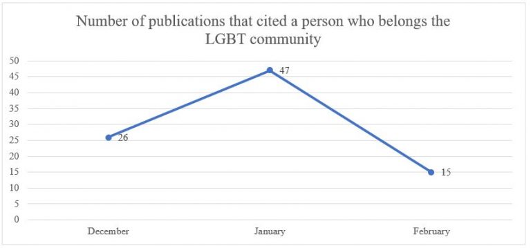 15 publications cited a person belonging to the LGBT community (6 transsexual or transgender people, 9 gay people). Notably, after observing an increase in citations in January that were caused by the win in the ECHR, the number of publications quoting an LGBT person has dropped.