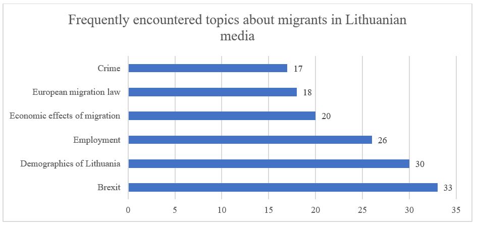 Migrants are discussed as part of such topics as Brexit (33 publications), demographics of Lithuania (30), employment (26), economic effects of migration (20), European migration law (18), crime (17).