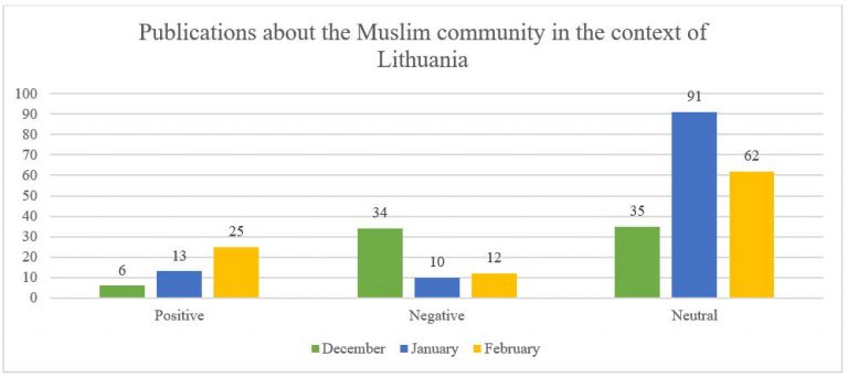 In the context of Lithuania, there were 99 publications about the Muslim community. Notably, there has been an increase in positive publications in the last few months. As for the negative publications – they decreased and remained at about the same level. The increase in positive numbers is related to a publication about hate crime, which has spread among numerous news portals and newspapers (starting with Vakarų ekspresas „Neapykantos incidentai vis dar išlieka opia problema“), as well as words said by the head of the Lithuanian Muslim association Ahmed Faraz during the annual book fair, which were striving to break down stereotypes surrounding the Muslim community (for example, „P.S. Krivickas. Septynios džiugės iš Vilniaus knygų mugės (nuotraukos)“, Alkas.lt). Overall, Muslims or representatives of the community were cited in 14 publications.