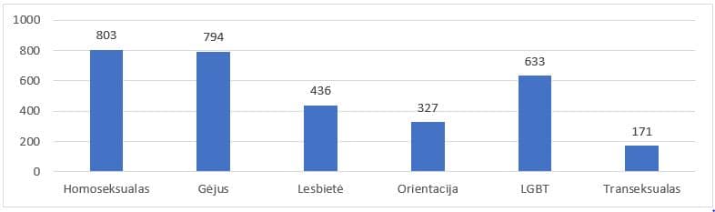 The media monitoring conducted from January to December of 2019 tracked journalistic work mentioning the terms “homosexual”, “gay”, “lesbian”, “orientation”, “LGBT”, “transgender”, and “gender reassignment”. In 12 months, 1676 journalistic works were selected. The most commonly used term is “homosexual” and the least frequently used is “transsexual”. The works discussing sexual orientation in the context of Lithuanian news were selected.