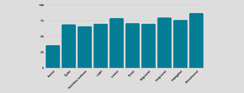 Neigiamo konteksto pasiskirstymas (proc.). Dažniausiai neigiamame kontekste vaizduojami romai, rečiausiai – žydai.