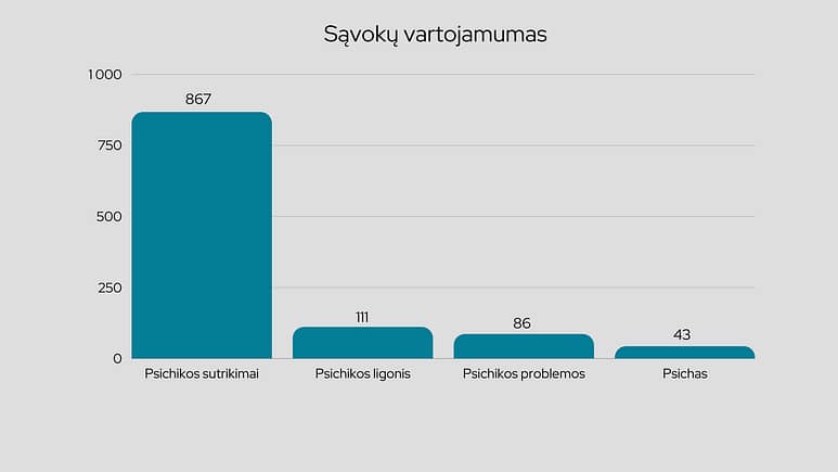 Per 12 mėnesių atrinkti 1054 žurnalistiniuose darbuose. Juose dažniausiai minima sąvoka „psichikos sutrikimai“ (867 žurnalistiniai darbai). Rečiausiai minėtas raktažodis – „psichas“ ( 43 kartus).